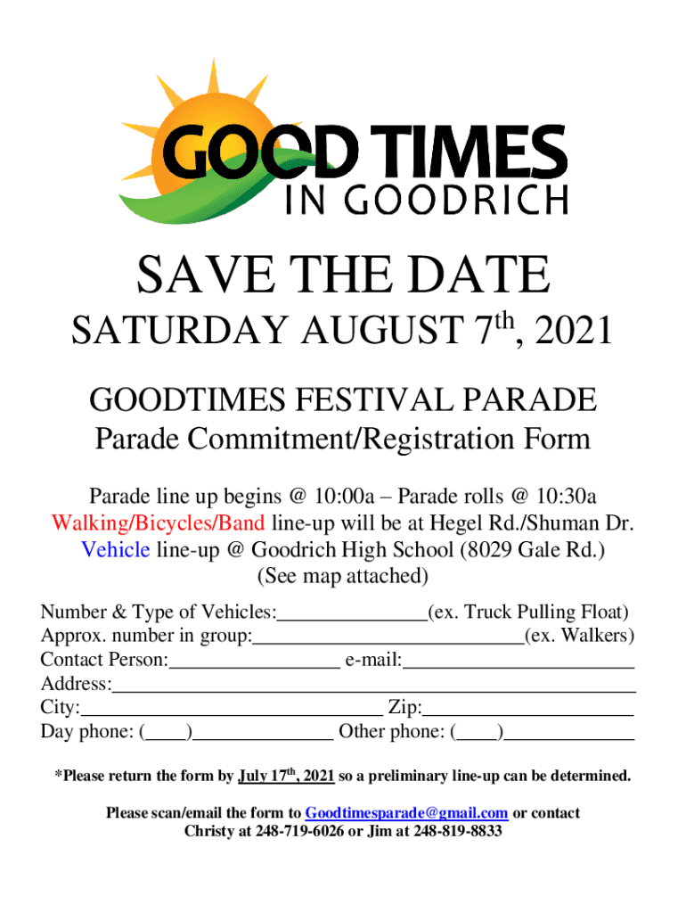 SAVE THE DATE SATURDAY, AUGUST 7th, 2021 GOODIES FESTIVAL PARADE Commitment/Registration Form Parade line up begins 10:00a Parade rolls 10:30a Walking/Bicycles/Band lineup will be at Hegel Rd./Human