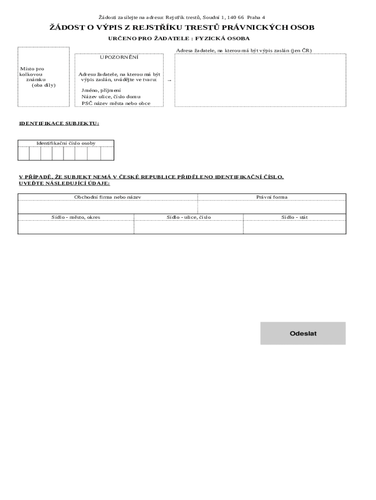 Send the applications to the address: Rest, Sound! “ “#$1, 140 66 Prada 4 APPLICATION FOR THE EXTRACT FROM THE CRIMINAL RECORD NATURAL PERSON INTENDED FOR THE APPLICANT:! “ #$ Address of the