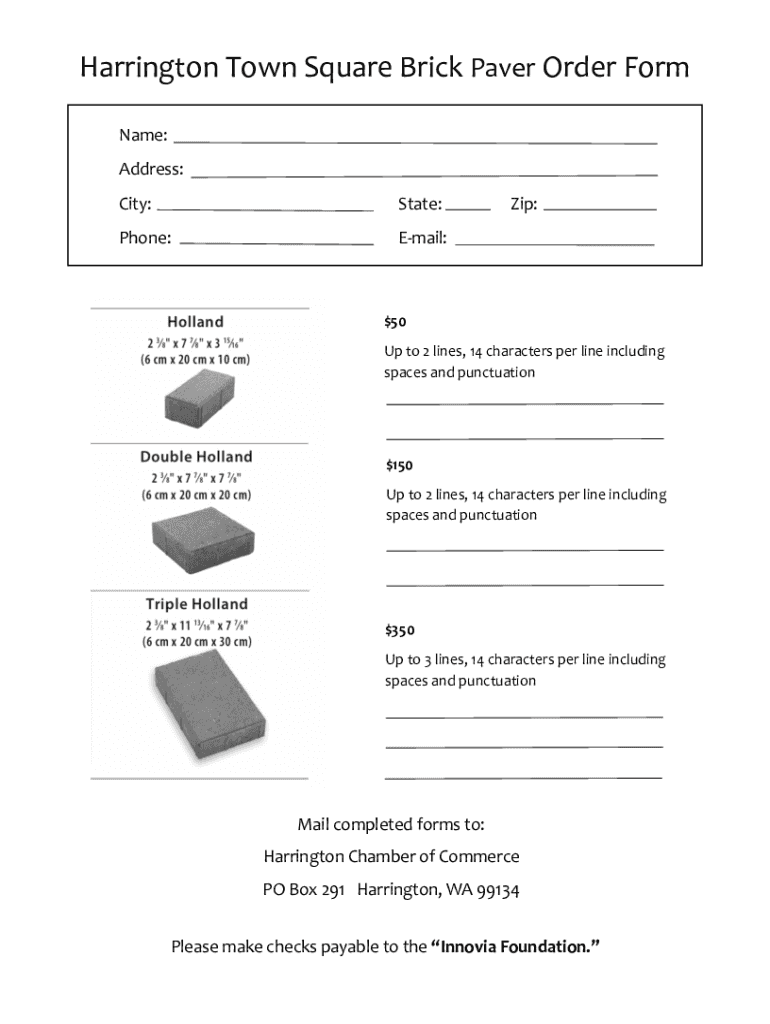 Harrington Town Square Brick Paver Order Forename:Address:City:State:Phone:Email:Zip:$50Up to 2 lines, 14 characters per line including spaces and punctuation$150Up to 2 lines, 14 characters per line