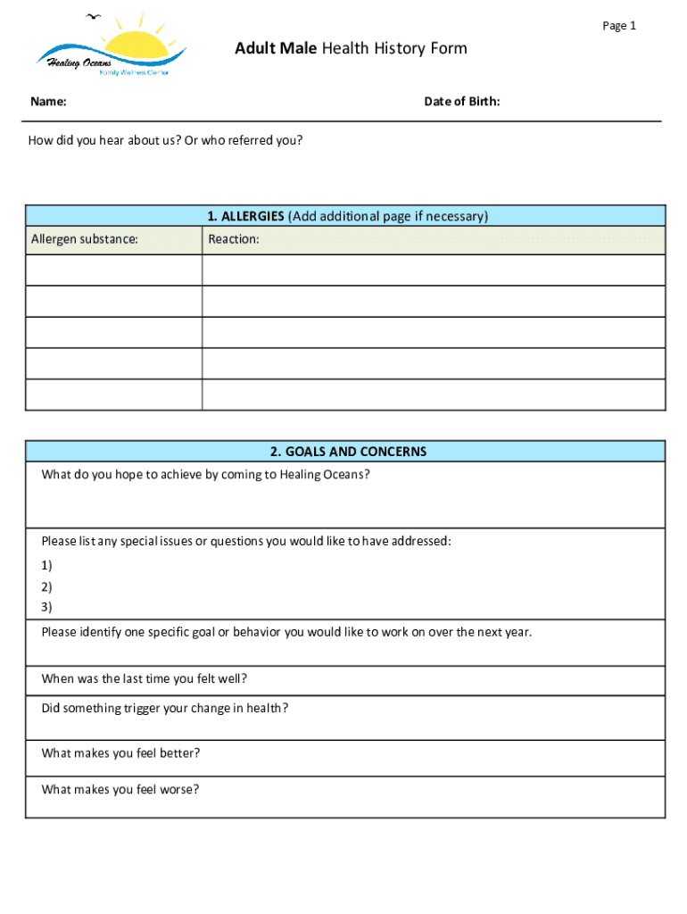 Page 1Adult Male Health History Form Name:Date of Birth:How did you hear about us? Or who referred you?1. ALLERGIES (Add additional page if necessary) Allergen substance:Reaction:2. GOALS AND CONCERNS