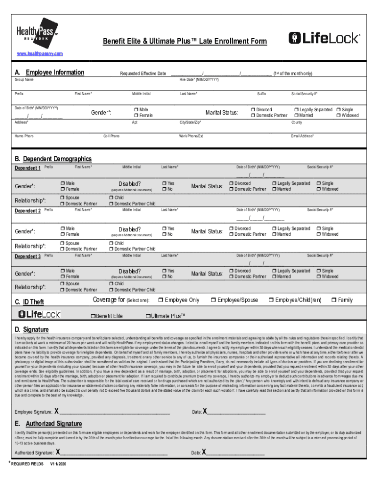 Benefit Elite & Ultimate Plus Late Enrollment Form www.healthpassny.comA. Employee InformationRequested Effective Date / / (1st of the month only)Group Name Prefixing Date* (MM/DD/YYY)First Name×Date