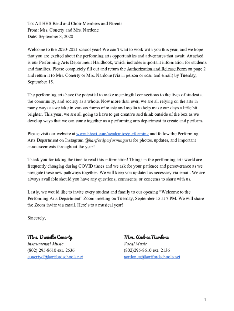 To: All HHS Band and Choir Members and Parents From: Mrs. Concert and Mrs. Pardon Date: September 8, 2020, Welcome to the 20202021 school year! We can't wait to work with you this year, and we hope