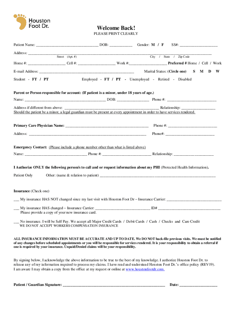 Welcome Back! PLEASE PRINT CLEARLY Patient Name: DOB: Gender: M / FSS#: Address: Street(Apt. #)City/State/Zip Wodehouse #: Cell #: Work #: Preferred # Home / Cell / Work Email Address: Student FT