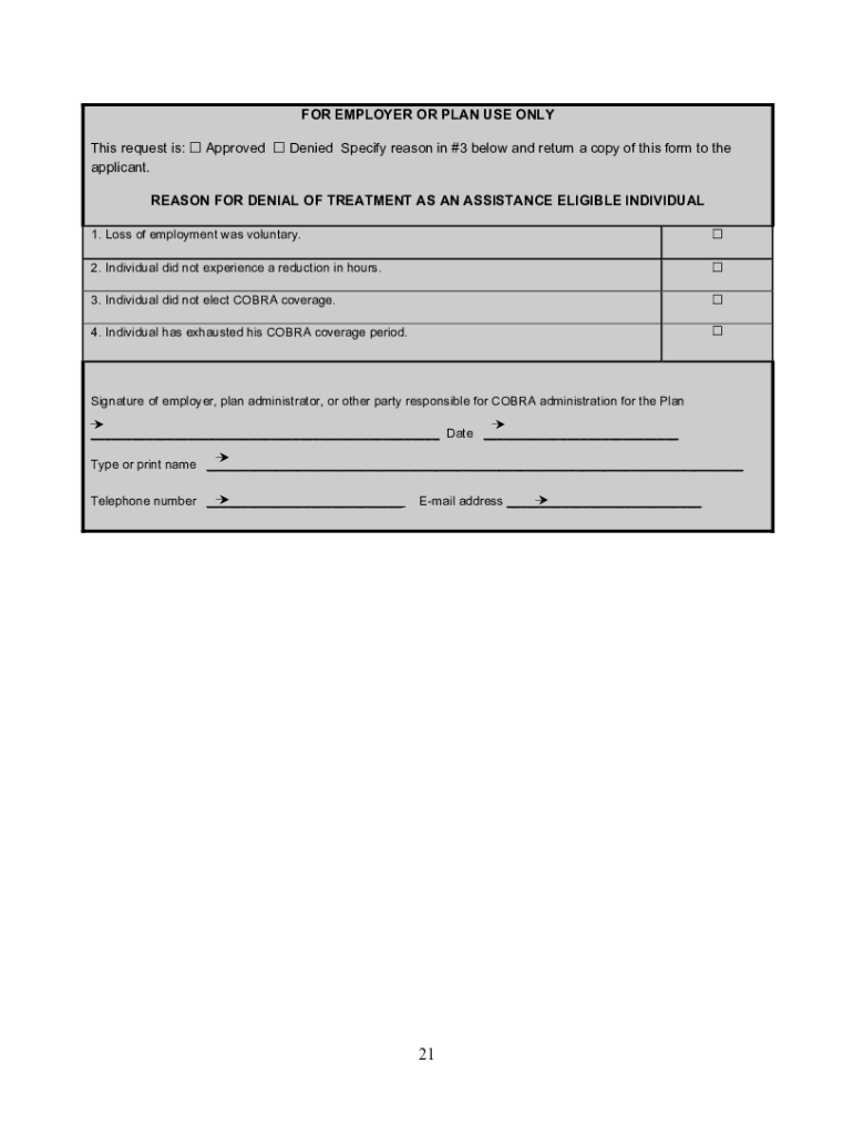 FOR EMPLOYER OR PLAN USE ONLY This request is: Approved Denied Specify reason in #3 below and return a copy of this form to the applicant. REASON FOR DENIAL OF TREATMENT AS AN ASSISTANCE ELIGIBLE