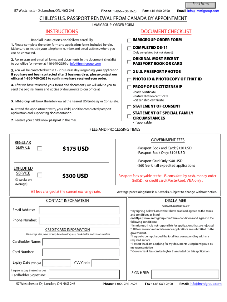 Print Form 57 Westchester Dr, London, ON, N6G 2K6Phone : 18667602623Fax: 4166402650Email: info@immigroup.comCHILD\'S U.S. PASSPORT RENEWAL FROM CANADA BY APPOINTMENT SEMIGROUP ORDER FORMINSTRUCTIONSDOCUMENT