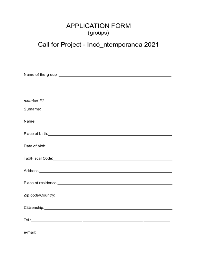 (groups)Call for Project Inc ntemporanea 2021Name of the group: member #1 Surname: Name: Place of birth: Date of birth: Tax/Fiscal Code: Address: Place of residence: Zip code/Country: Citizenship:
