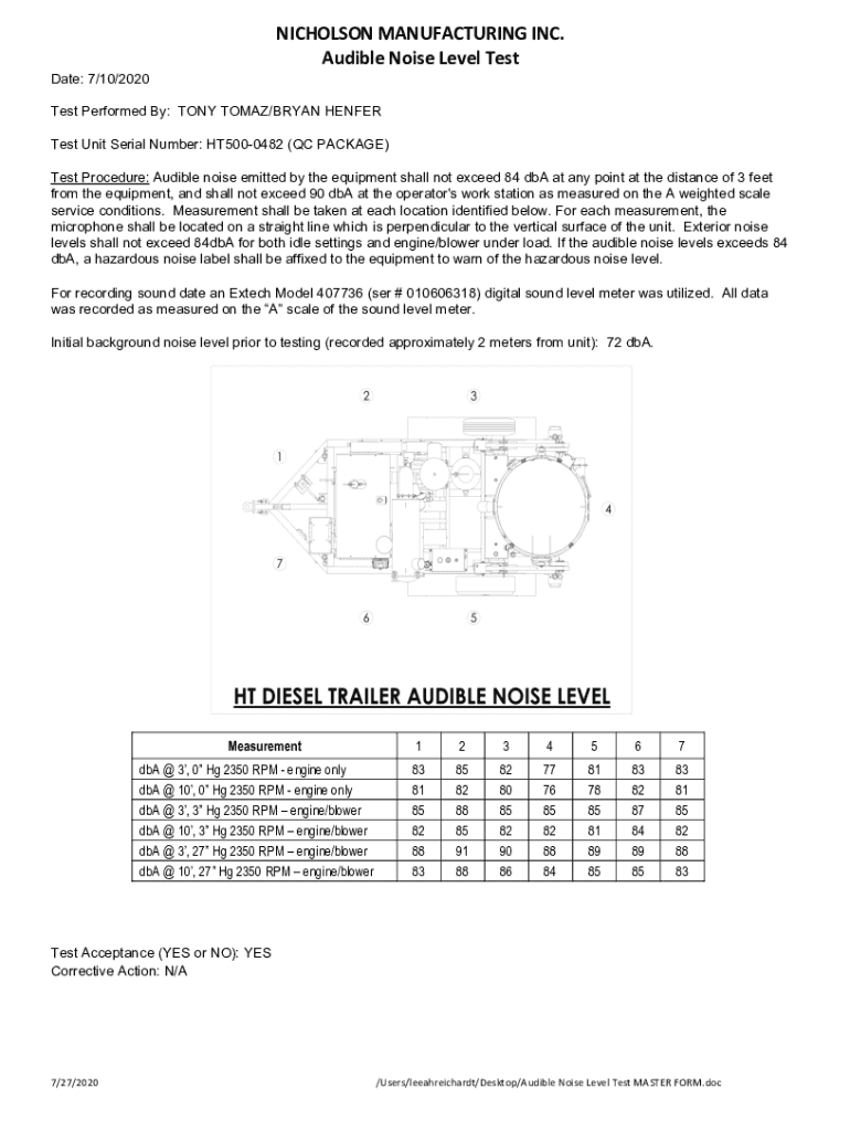 NICHOLSON MANUFACTURING INC. Audible Noise Level Test Date: 7/10/2020 Test Performed By: TONY TOPAZ/BRYAN HEIFER Test Unit Serial Number: HT5000482 (QC PACKAGE) Test Procedure: Audible noise emitted