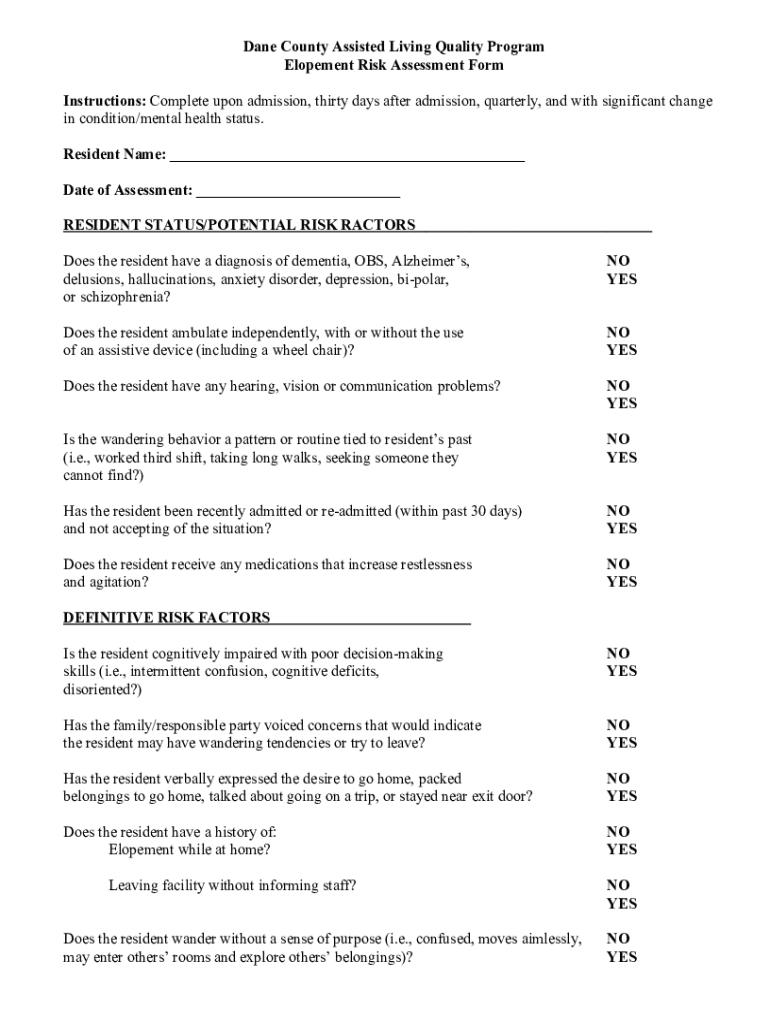 Dane County Assisted Living Quality Program Elopement Risk Assessment Form Instructions: Complete upon admission, thirty days after admission, quarterly, and with significant change in condition/mental