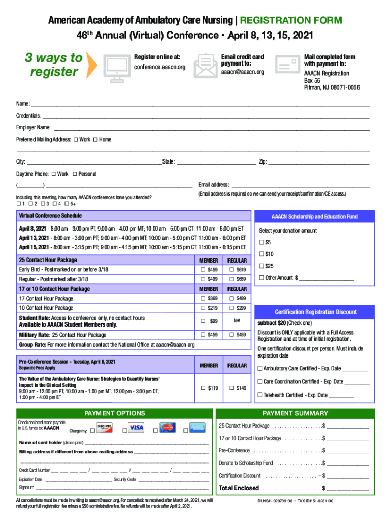 American Academy of Ambulatory Care Nursing REGISTRATION FORM 46th Annual (Virtual) Conference April 8, 13, 15, 20213 ways to registerRegister online at: conference.again.remain credit card payment