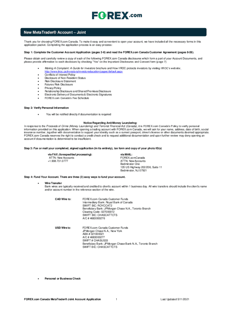 New Retarder Account Joint Thank you for choosing FOREX.com Canada. To make it easy and convenient to open your account, we have included all the necessary forms in this application packet. Completing