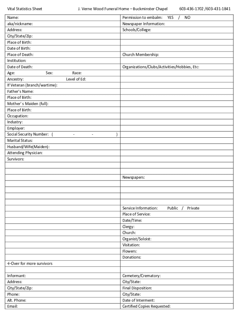 Vital Statistics Sheet Name: aka/nickname: Address: City/State/Zip: Place of Birth: Date of Birth: Place of Death: Institution: Date of Death: Age: Sex: Ancestry: If Veteran (branch/wartime): Father\'s