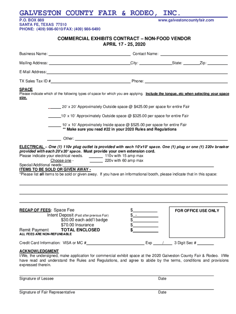 GALVESTON COUNTY FAIR & RODEO, INC. P.O. BOX 889 SANTA FE, TEXAS 77510 PHONE: (409) 9866010/FAX: (409) 9866490www.galvestoncountyfair.noncommercial EXHIBITS CONTRACT NONFOOD VENDOR APRIL 17 25, 2020