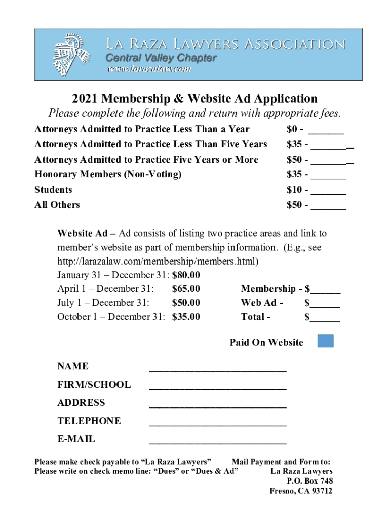 2021 Membership & Website Ad Application Please complete the following and return with appropriate fees. Attorneys Admitted to Practice Less Than a Year Attorneys Admitted to Practice Less Than Five