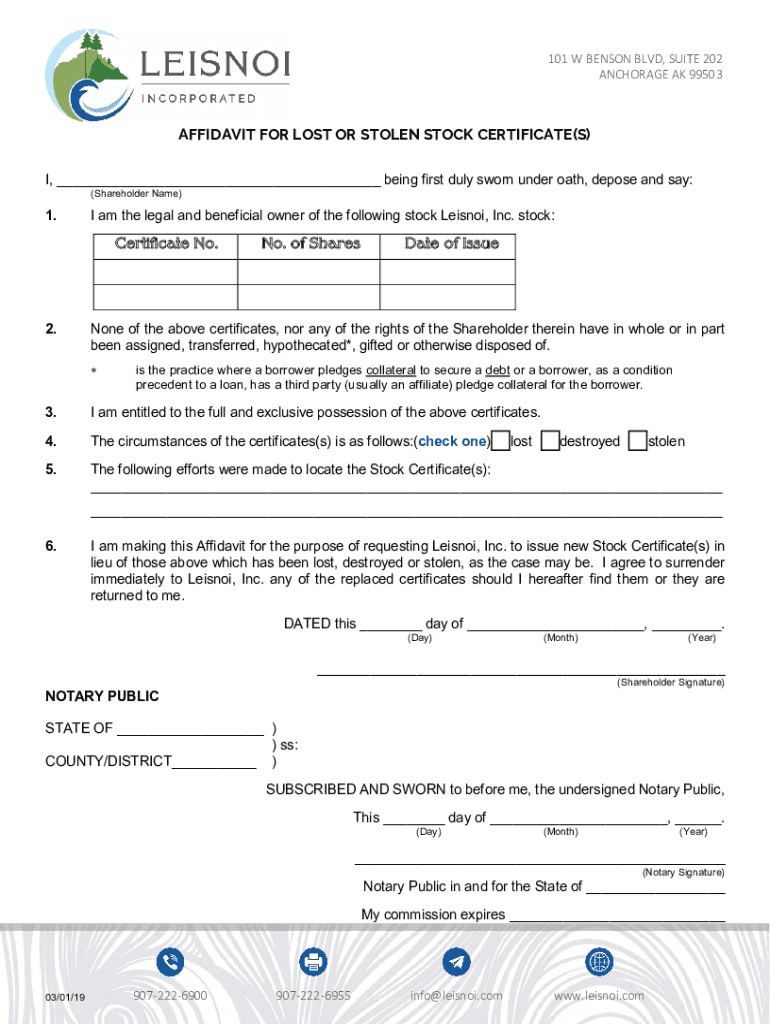 101 W BENSON BLVD, SUITE 202 ANCHORAGE AK 99503AFFIDAVIT FOR LOST OR STOLEN STOCK CERTIFICATE(S) I, being first duly sworn under oath, depose and say: (Shareholder Name)1. I am the legal and beneficial