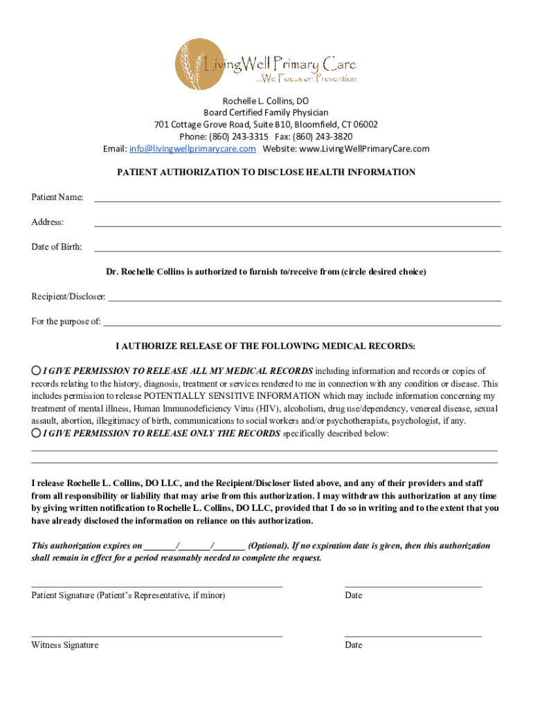 Rochelle L. Collins, DO Board Certified Family Physician 701 Cottage Grove Road, Suite B10, Bloomfield, CT 06002 Phone: (860) 2433315 Fax: (860) 2433820 Email: info livingwellprimarycare.com Website: