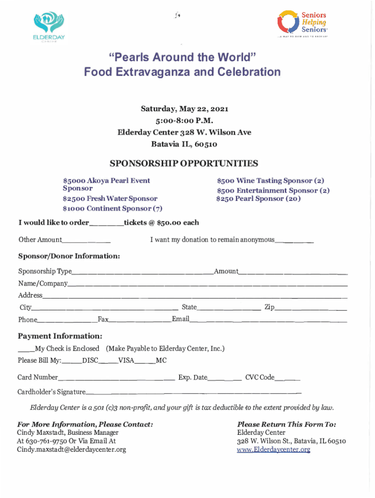 “Pearls Around the World Food Extravaganza and Celebration Saturday, May 22, 2021 5:008:00 P.M. Elder day Center 328 W. Wilson Ave Batavia IL,60510SPONSORSHIP OPPORTUNITIES $5000 Akola Pearl Event
