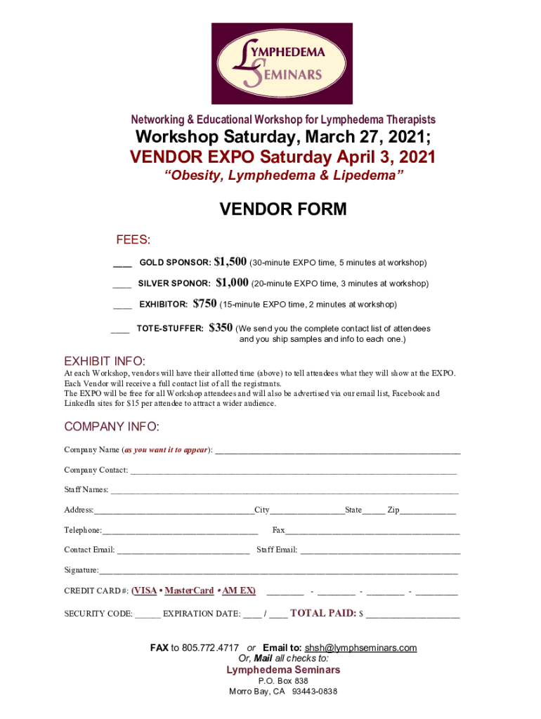 Networking & Educational Workshop for Lymphedema TherapistsWorkshop Saturday, March 27, 2021; VENDOR EXPO Saturday, April 3, 2021, Obesity, Lymphedema & LipedemaVENDOR FORM FEES: GOLD SPONSOR:$1,500