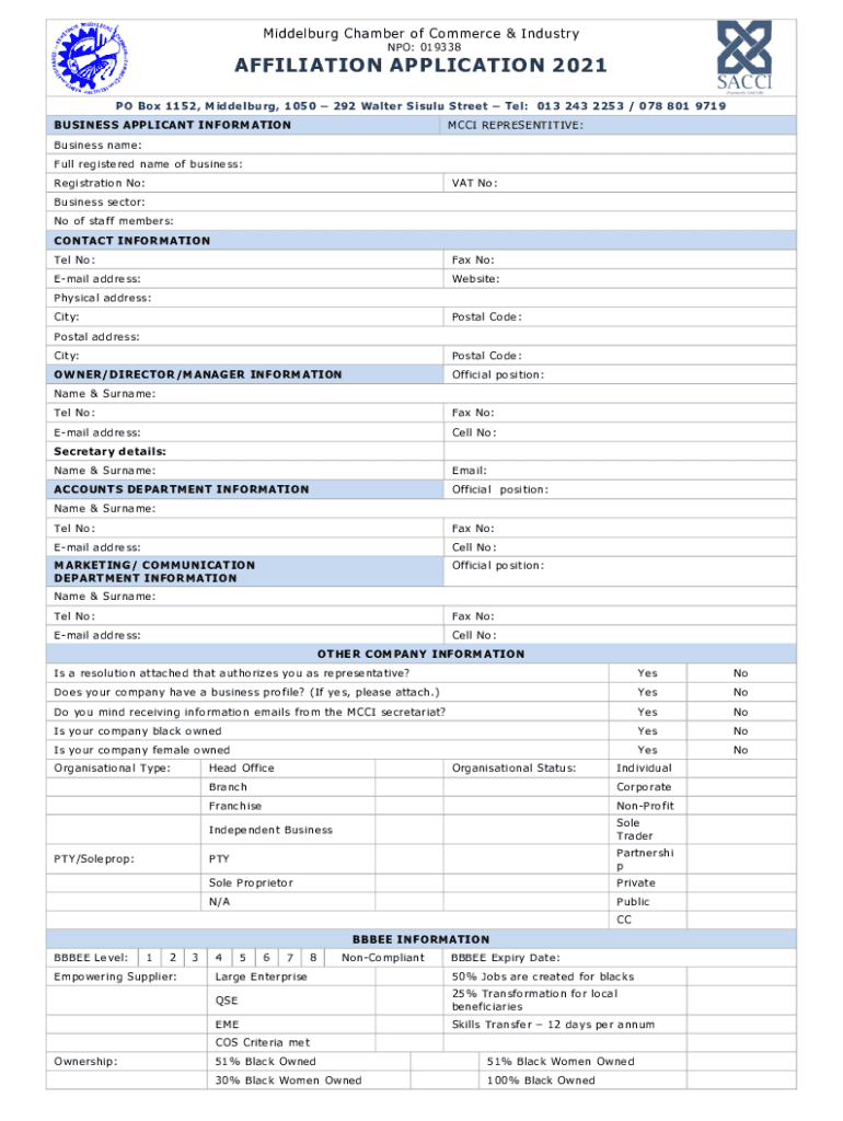 Middelburg Chamber of Commerce & Industry NPO: 019338AFFILIATION APPLICATION 2021 PO Box 1152, Middelburg, 1050 292 Walter Isuzu Street Tel: 013 243 2253 / 078 801 9719 BUSINESS APPLICANT INFORMATIONMCCI