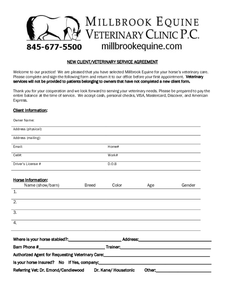 NEW CLIENT/VETERINARY SERVICE AGREEMENT Welcome to our practice! We are pleased that you have selected Mill brook Equine for your horses veterinary care. Please complete and sign the following form
