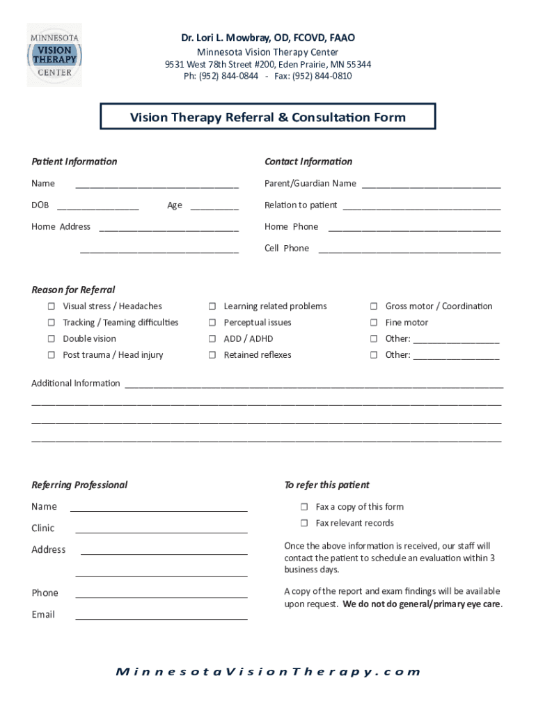 Dr. Lori L. Mow bray, OD, FCO VD, FAO Minnesota Vision Therapy Center 9531 West 78th Street #200, Eden Prairie, MN 55344 pH: (952) 8440844 Fax: (952) 8440810Vision Therapy Referral & Consultant Form