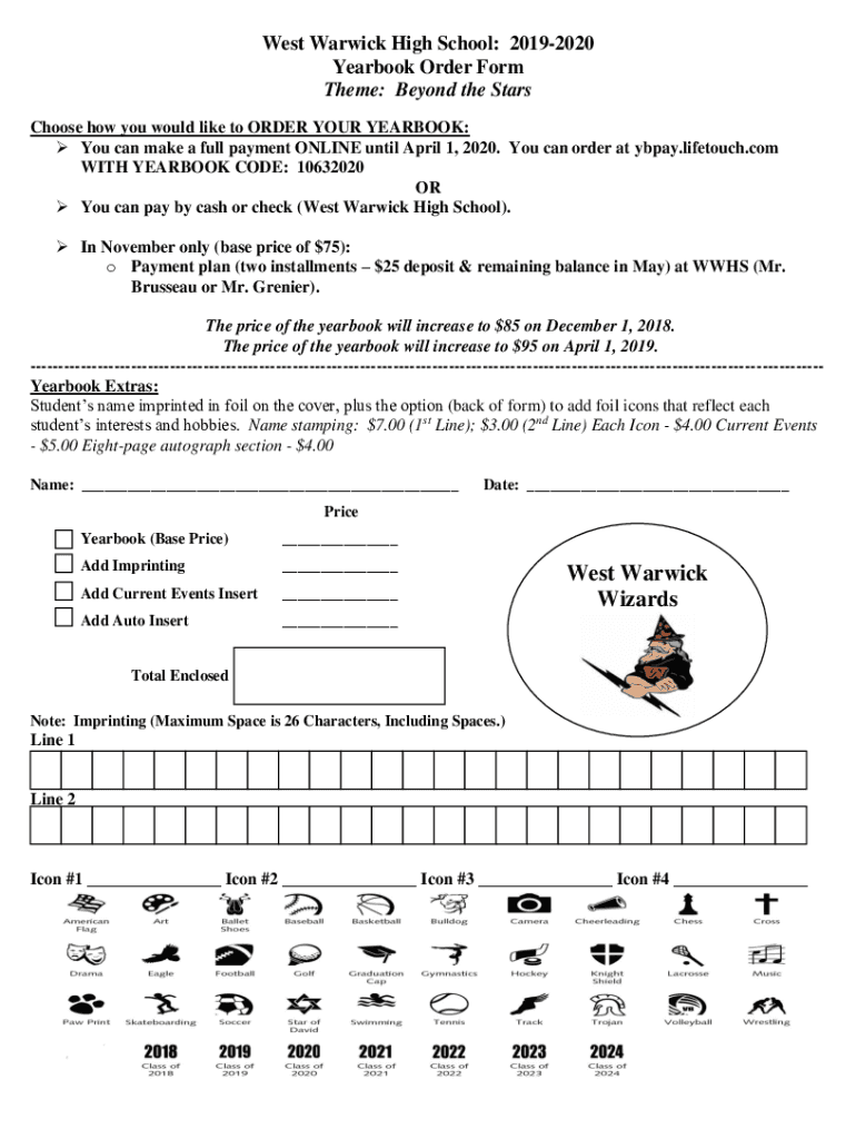 West Warwick High School: 20192020 Yearbook Order Form Theme: Beyond the Stars Choose how you would like to ORDER YOUR YEARBOOK: You can make a full payment ONLINE until April 1, 2020. You can order
