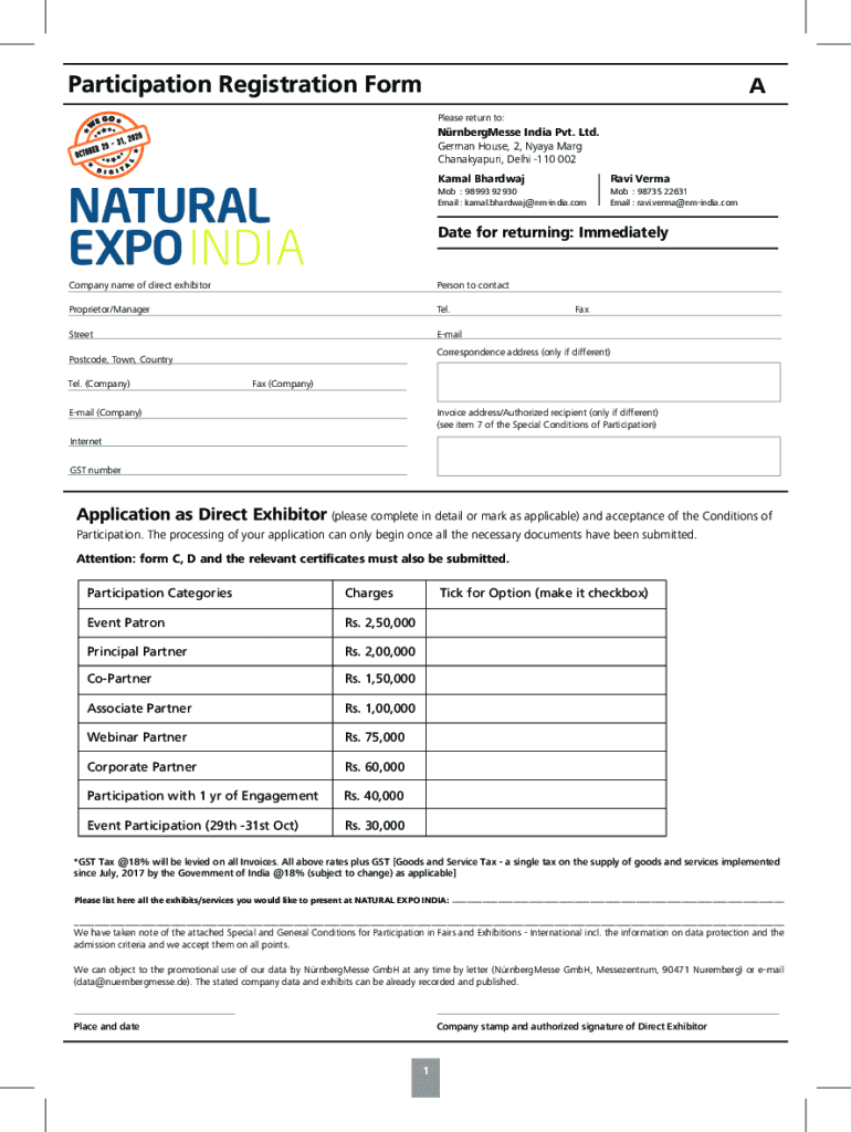 Participation Registration Form Application As Direct Exhibitors 3OHDVHUHWXUQWRIndia Expo Center, IEMLGreater Noida, Delhi NCR, India 2FWREHUNrnbergMesse India Pvt. Ltd. *HU PDQ+RXVH1DD0DUJ &KDQDNDSXUL