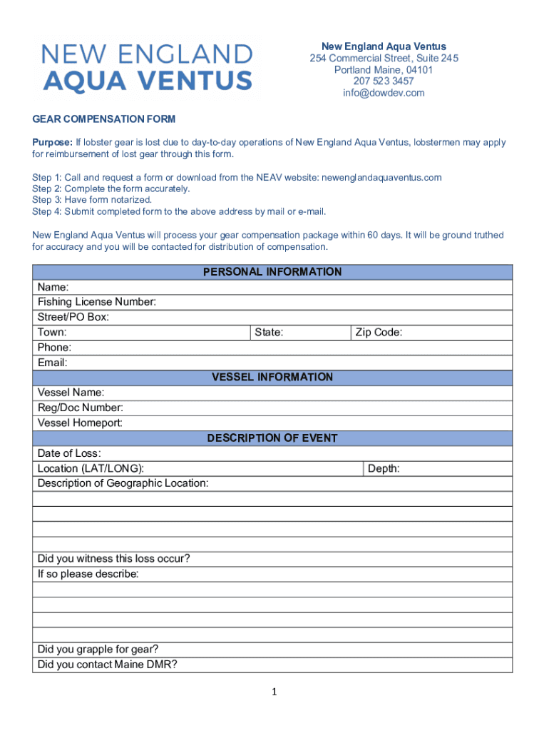 New England Aqua Venus 254 Commercial Street, Suite 245 Portland Maine, 04101 207 523 3457 info@dowdev.com GEAR COMPENSATION FORM Purpose: If lobster gear is lost due to day today operations of New