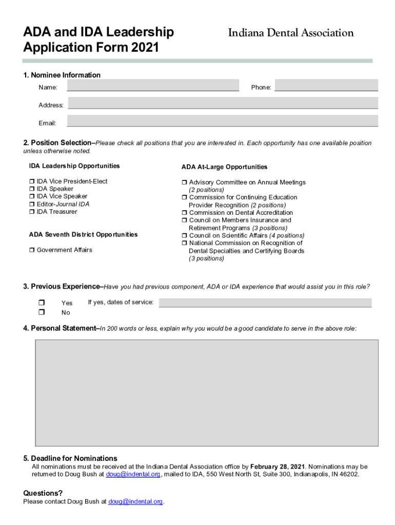 ADA and IDA Leadership Application Form 2021Indiana Dental Association1. Nominee Information Name:Phone:Address: Email:2. Position SelectionPlease check all positions that you are interested in. Each