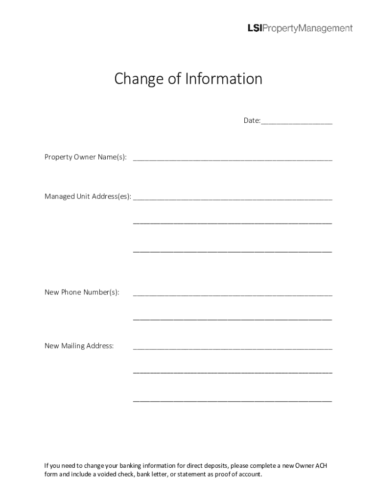 Change of Information Date: Property Owner Name(s): Managed Unit Address(BS): New Phone Number(s): New Mailing Address: If you need to change your banking information for direct deposits, please complete