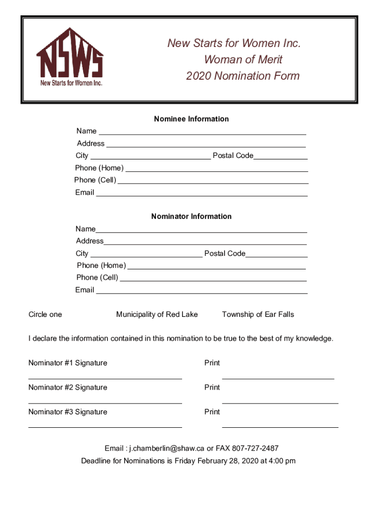 New Starts for Women Inc. Woman of Merit 2020 Nomination FormNominee Information Name Address City Postal Code Phone (Home) Phone (Cell) Email Nominator Information Name Address City Postal Code Phone