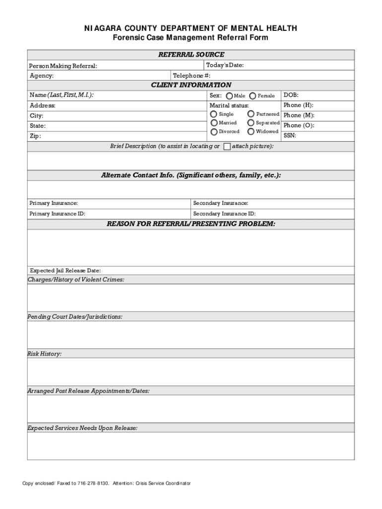 NIAGARA COUNTY DEPARTMENT OF MENTAL HEALTH Forensic Case Management Referral Form REFERRAL SOURCE Today\'s Date:Person Making Referral: Agency:Telephone #:CLIENT INFORMATION Name (Last, First, M.I.):Sex:Address:Marital