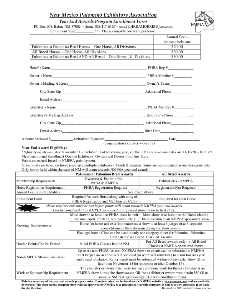 New Mexico Palomino Exhibitors Association Year End Awards Program Enrollment Form PO Box 908, Been, NM 87002 phone 5054176167 email LHRRAMORRIS juno.com Enrollment Year ** Please complete one form