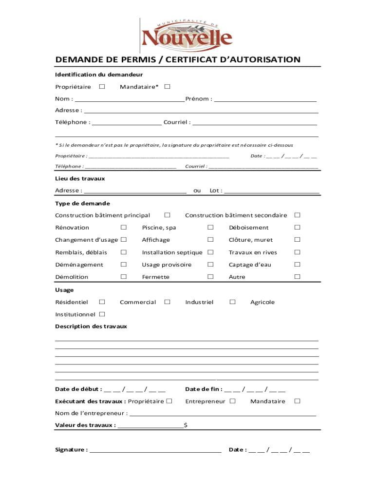 DEMAND DE PERMIT / CERTIFICATE AUTHORIZATION Identification Du demander PropritaireMandataire* Not : Prom : Address : Tl phone : Courier : * Si LE demander nest pas LE proprietary, la signature Du