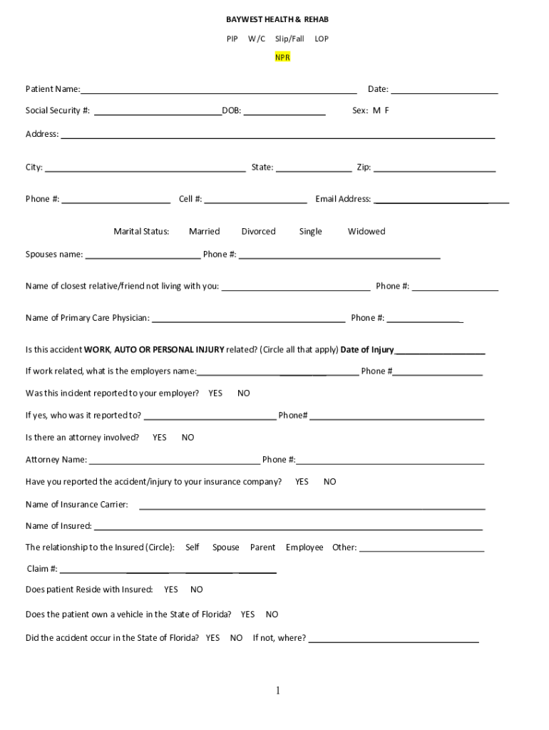 BAYES HEALTH & REHAB PIPE/Clip/FallLOPNPRPatient Name: Social Security #:Date: DOB: Sex: MF Address: City:State:Phone #:Zip:Cell #: Marital Status:Email Address: MarriedSpouses name: DivorcedSingleWidowedPhone