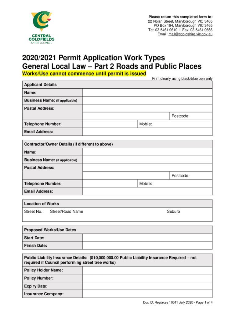 Please return this completed form to: 22 Nolan Street, Maryborough VIC 3465 PO Box 194, Maryborough VIC 3465 Tel: 03 5461 0610 I Fax: 03 5461 0666 Email: mail@cgoldshire.vic.gov.au2020/2021 Permit