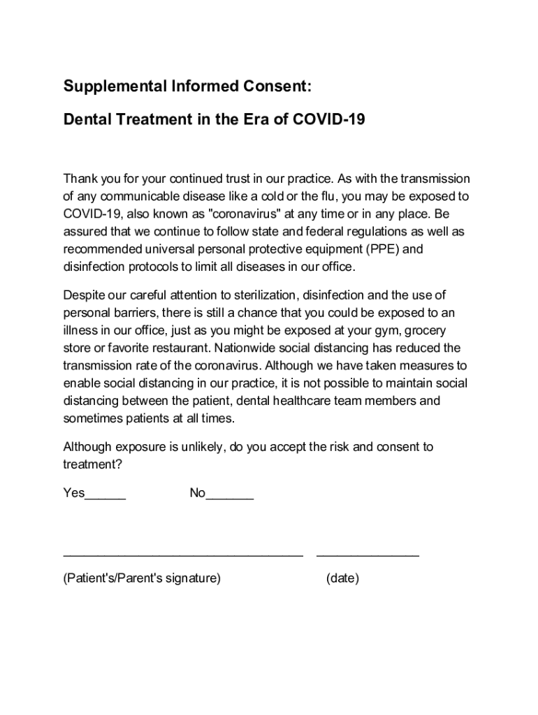 Supplemental Informed Consent: Dental Treatment in the Era of COVID19Thank you for your continued trust in our practice. As with the transmission of any communicable disease like a cold or the flu,