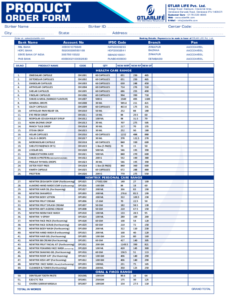 PRODUCTOTLAR LIFE Pvt. Ltd.ORDER FORMOTLARLIFE The Wellness RevolutionStriker Name: ........................................................ Striker ID: ......................................................