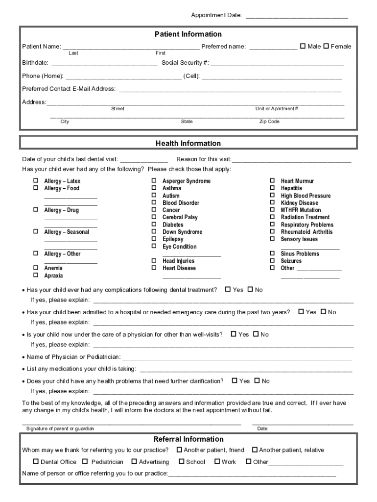 Appointment Date: Patient Information Patient Name: Preferred name: LastMaleFemaleFirstBirthdate: Social Security #: Phone (Home): (Cell): Preferred Contact Email Address: Address: StreetUnit or Apartment