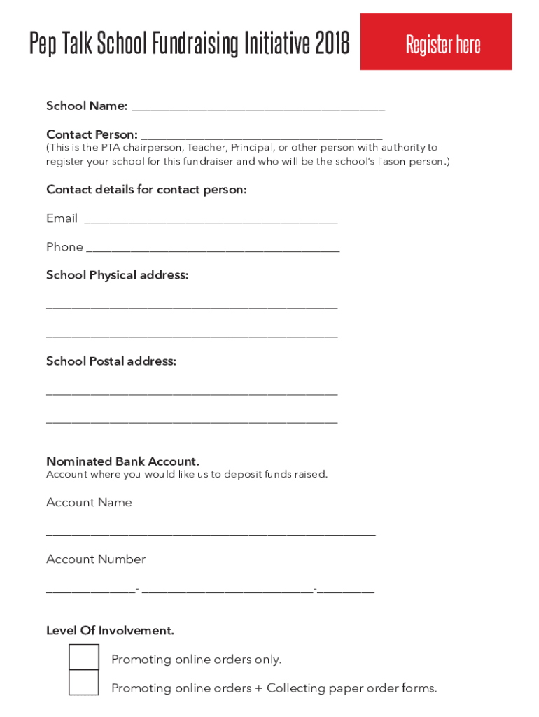 Pep Talk School Fundraising Initiative 2018Register preschool Name: Contact Person: (This is the PTA chairperson, Teacher, Principal, or other person with authority to register your school for this