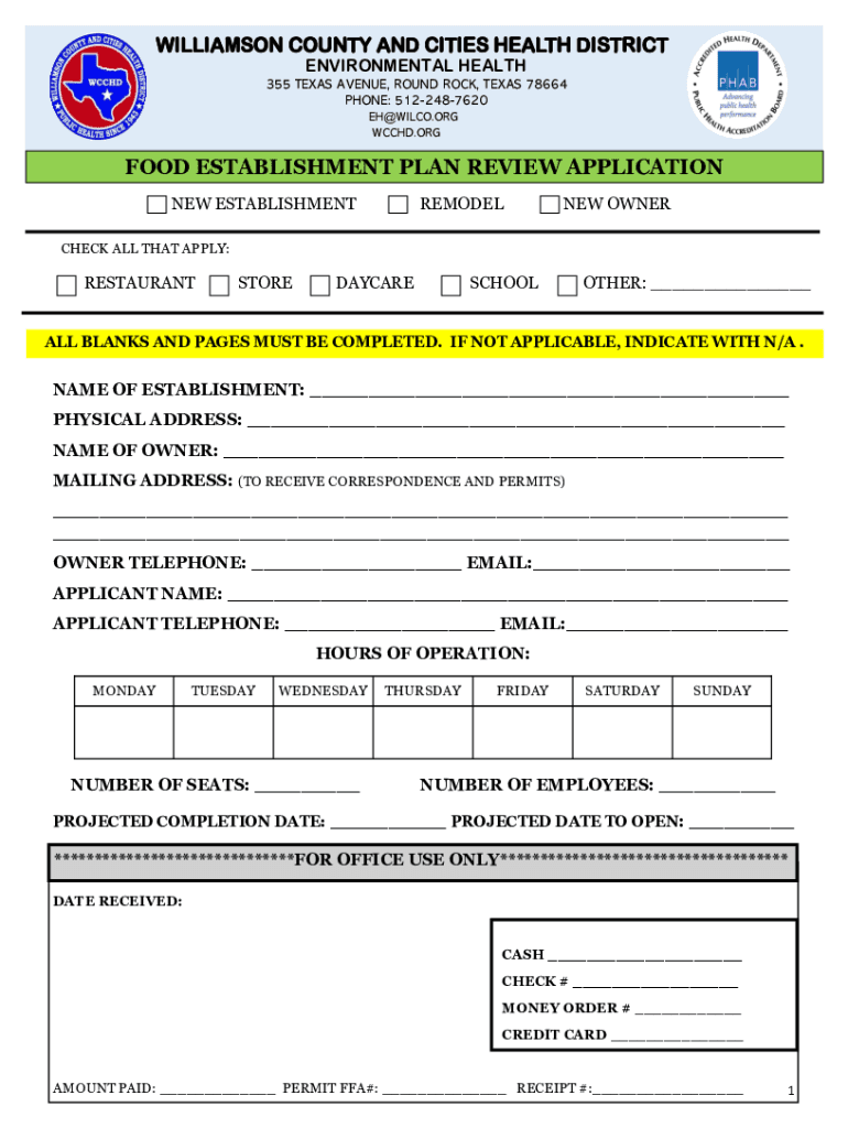 WILLIAMSON COUNTY AND CITIES HEALTH DISTRICT ENVIRONMENTAL HEALTH355 TEXAS AVENUE, ROUND ROCK, TEXAS 78664 PHONE: 5122487620 EH WILCOX.ORG WC CHD.OSGOOD ESTABLISHMENT PLAN REVIEW APPLICATION NEW ESTABLISHMENTREMODELNEW