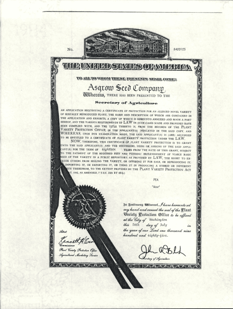 8400125No. A5groro Celt (Cotton 'QF’ll her.EAS, AN APPLICATION OF SEXUALLY THEREQUESTINGREPRODUCEDAPPLICATIONTHERE HAS BEEN PRESENTED TO THEA CERTIFICATEPLANT, AND EXHIBITS, TH EOF PROTECTION AN