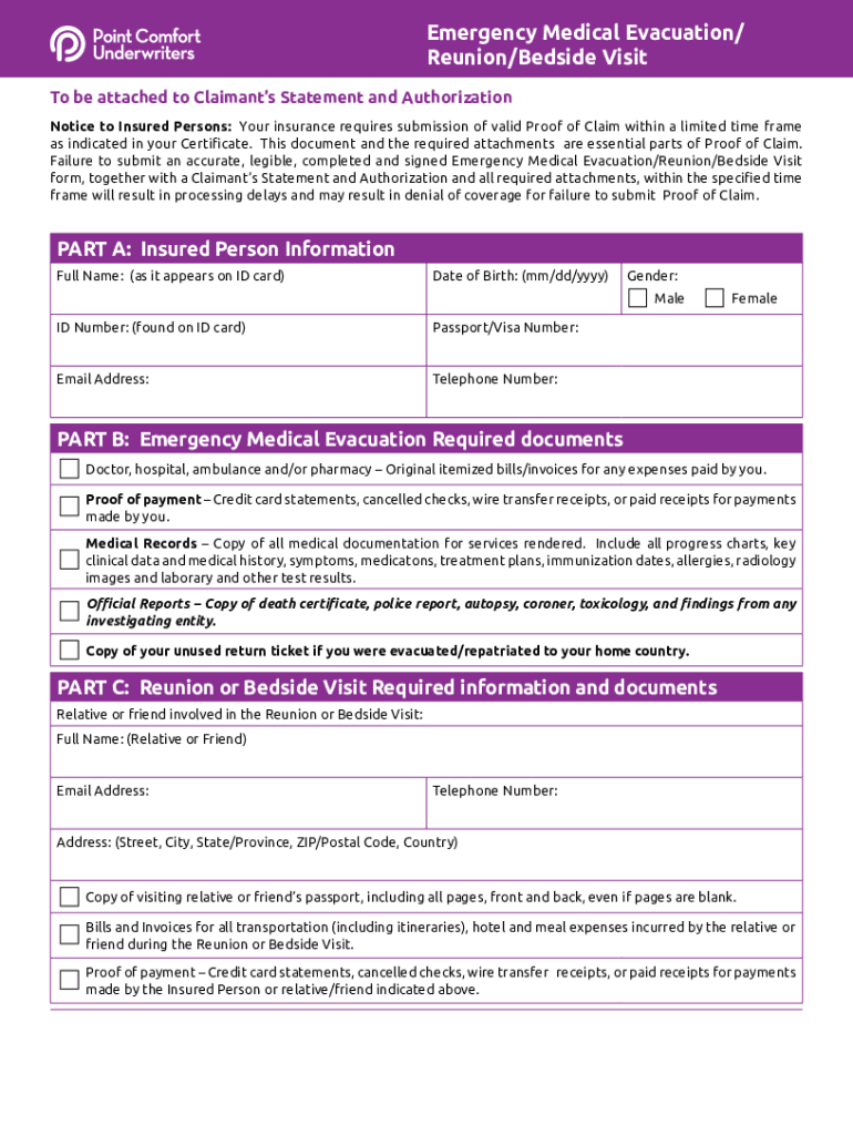 Emergency Medical Evacuation/ Reunion/Bedside Visit To be attached to Claimants Statement and Authorization Notice to Insured Persons: Your insurance requires submission of valid Proof of Claim within