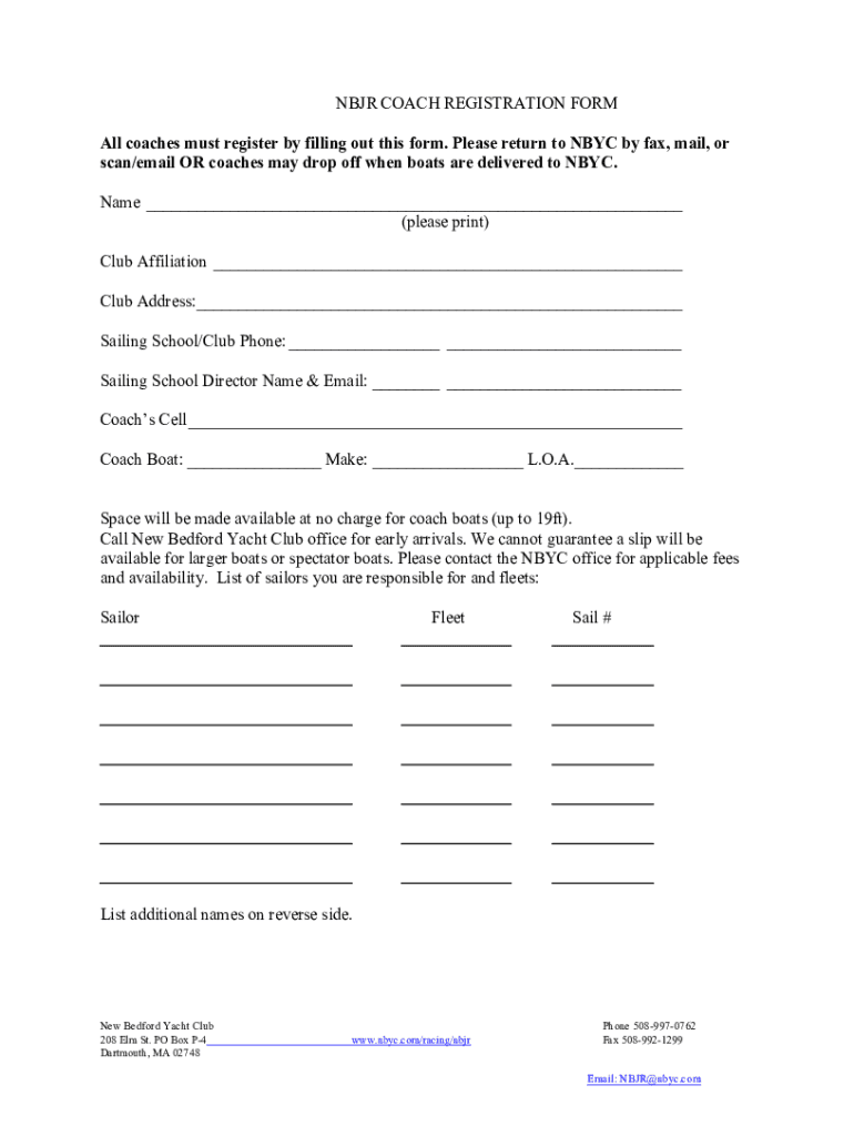 The registration form for all coaches must include the coach's name, contact information, coaching experience, certifications, and any relevant background information.