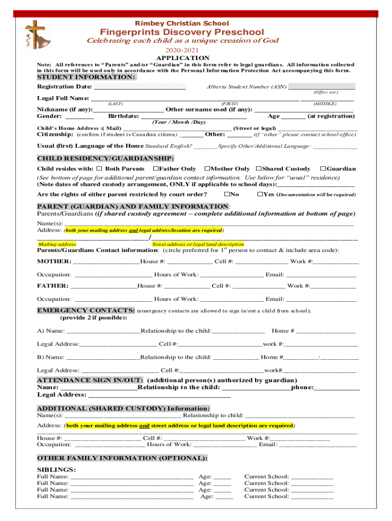 Rumba Christian SchoolFingerprints Discovery PreschoolCelebrating each child as a unique creation of God 20202021 APPLICATION Note: All references to Parents and/or Guardian in this form refer to