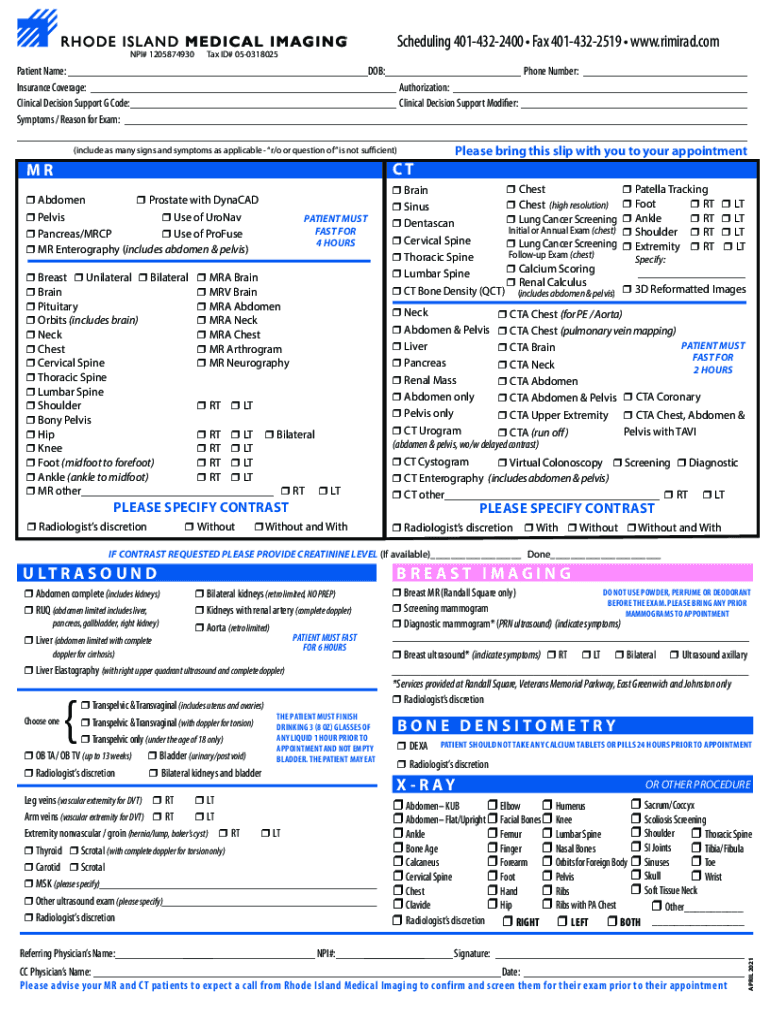 NPI# 1205874930Scheduling 4014322400 Fax 4014322519 www.rimirad.comTax ID# 050318025Patient Name: DOB: Phone Number: Insurance Coverage: Authorization: Clinical Decision Support G Code: Clinical Decision