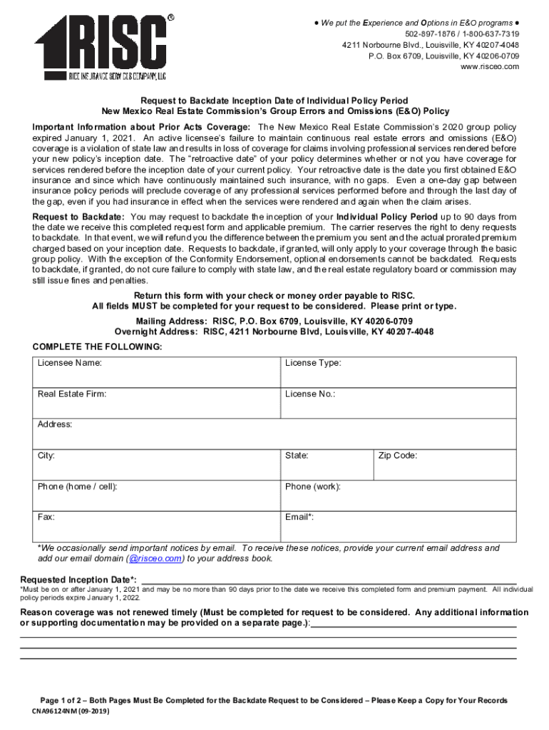 We put the Experience and Options in E&O programs 5028971876 / 18006377319 4211 Norborne Blvd., Louisville, KY 402074048 P.O. Box 6709, Louisville, KY 402060709 www.risceo.comRequest to Backdate Inception