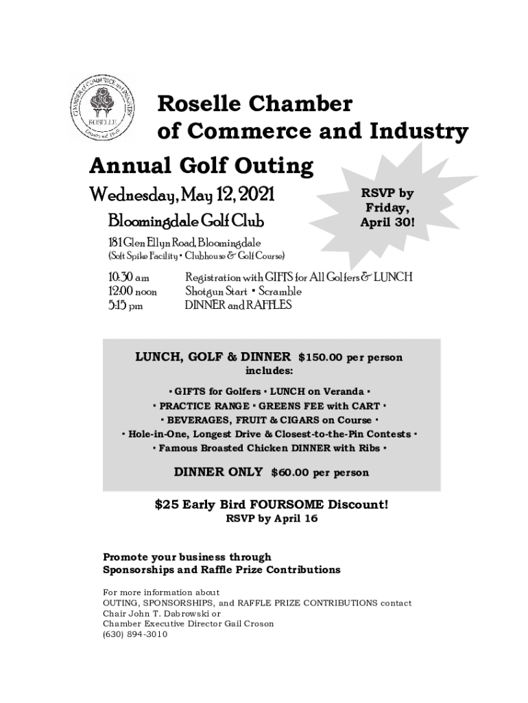 Roselle Chamber of Commerce and Industry Annual Golf Outing Wednesday, May 12, 2021, Bloomingdale Golf Club RSVP by Friday, April 30!181 Glen Ellyn Road, Bloomingdale (Soft Spike Facility Clubhouse
