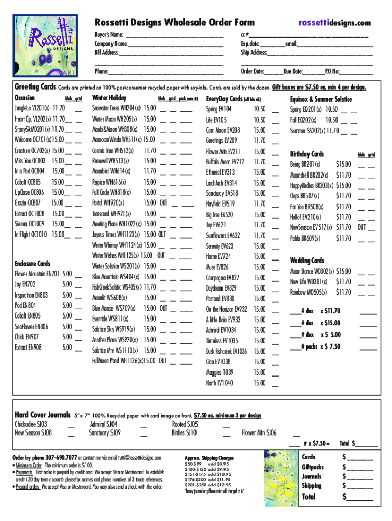 Rossetti Designs Wholesale Order Form Buyers Name: Company Name: Bill Address: Phone: rossettidesigns. Comic # Exp.date: email: Ship Address: Order Date: Due Date: P.O. No: Greeting Cards are printed