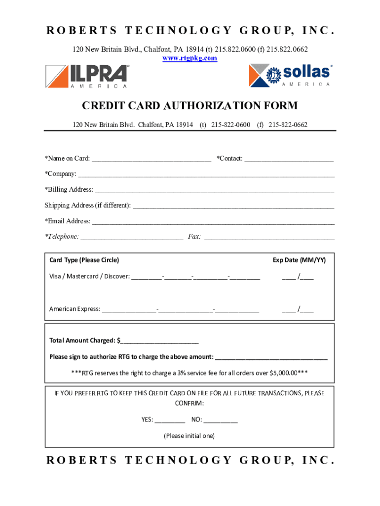 R O B E R T S T E C H N O L O G Y G R O U P, I N C. 120 New Britain Blvd., Chant, PA 18914 (t) 215.822.0600 (f) 215.822.0662 www.rtgpkg.comCREDIT CARD AUTHORIZATION FORM 120 New Britain Blvd. Chant,