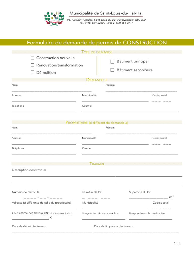 Municipality de SaintLouisduHa! Ha! 95, rue Saint Charles, SaintLouisduHa! Ha! (Quebec) G0L 3S0 Tl.: (418) 8542260 / TLC.: (418) 8540717Formulaire de demand DE permit DE construction Type DE demand